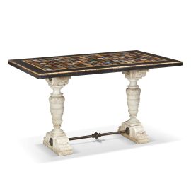 in marmi policromi e bronzo patinato. Il piano, di forma rettangolare, è costituito da una lastra di marmo nero bordato di giallo decorato sulla superficie con intarsio a scacchiera di piccoli quadrati di marmi policromi. La base è scolpita in marmo bianco e composta da due sostegni torniti poggianti su piedi a mensola, decorati da intagli e grandi foglie a rilievo, riuniti tra loro da due traverse in bronzo con nodo centrale e rosoni alle estremità; cm 86x152x89