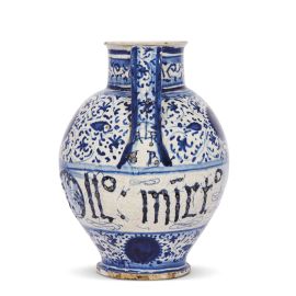 in maiolica dipinta in policromia con prevalenza del blu, corpo piriforme con stretto collo cilindrico appena svasato su piede a disco, beccuccio tubolare appena rastremato in cima e ansa a nastro. L’intera superficie del contenitore farmaceutico mostra il tipico decoro cosiddetto “alla porcellana”, caratterizzato da sottili decori a trama vegetale intervallati da corolle a disco con il bordo dentellato, ad eccezione della fascia centrale, che ospita un largo cartiglio con iscrizione Olio.mirto e che si chiude sul fronte, sotto il cannello, con tocchi di giallo ocra. Alla base dell’ansa in blu sono tracciate alcune lettere capitali; alt. cm 27, diam. bocca cm 9,8, diam. piede cm 10,8