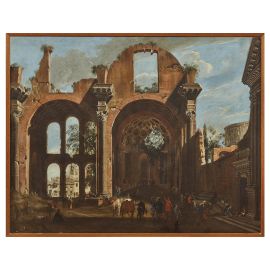 Se la Basilica di Costantino (generalmente nota con l’attribuzione a Massenzio) è protagonista di numerose vedute codazziane, più rara è la sua contestualizzazione, fondamentalmente realistica se pure con qualche aggiustamento prospettico, grazie alla raffigurazione del Colosseo e della facciata di Santa Francesca Romana perpendicolare alla Basilica stessa, come pure della Torre delle Milizie sullo sfondo.