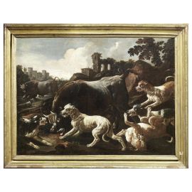 A BULL ATTACKED BY DOGS