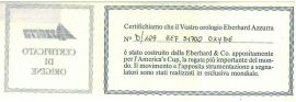 cassa in pvd, fondello a pressione recante scritta "Sfida italiana America's Cup 1983", corona marcata e tasti a pompa, lunetta nera in pvd, quadrante nero, grafica oro, indici applicati, a ore dodici cinque grandi finestre per contatori del cronografo, cinturino nero originale in caucciù, chiusura doppia deployant in acciaio marcata Eberhard. Diam. mm 38. Corredato di scatola e garanzia.