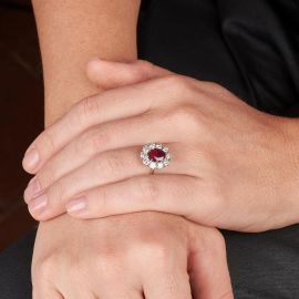 in oro bianco 18kt, al centro un rubino birmano taglio ovale di ct 1.60 circa, circondato da una fila di diamanti taglio brillante per ct 1.50 circa, mis. 15/55, gr. 4. Corredato di certificato IGN del 16/10/2023 attestante l'assenza di trattamenti termici e l'origine della pietra.