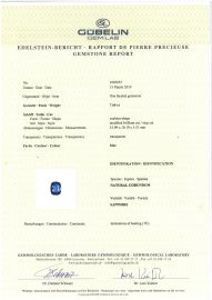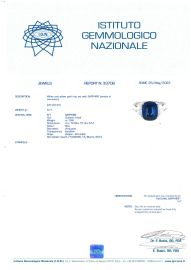 in oro giallo e bianco 18kt, al centro uno zaffiro ceylon taglio cuscino di ct 7.66, affiancato da due diamanti taglio trilliant per ct 2.40 circa, punzone 750, mis. 15/55, gr. 9. Corredato di certificati Gubelin del 15/03/2010 e IGN del 25/05/2023 attestanti le caratteristiche e l'origine geografica della pietra.