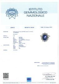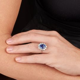 in oro bianco 18kt, al centro uno zaffiro ceylon taglio ovale di ct 4.70 circa, circondato da una fila di diamanti taglio brillante per ct 1.90 circa, punzoni 750 e del fabbricante, mis. 12/52, gr. 5. Corredato di certificato IGN del 16/10/2023 attestante l'assenza di trattamenti termici e l'origine geografica della pietra.