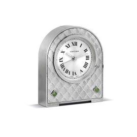 in acciaio, raffigurante un motivo a palme inciso con due pietre verdi applicate, quadrante argenté firmato "Cartier", numeri romani smaltati, movimento a carica manuale, dim. cm 6,5x7,5, gr. 403. Corredata di scatola.