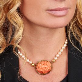 composta da un filo di perle di mm 7 circa, fermatura ed elemento centrale in oro giallo satinato 18kt con corallo inciso raffigurante degli angeli in volo, punzoni 750 e del fabbricante, lungh. cm 38, gr. 47