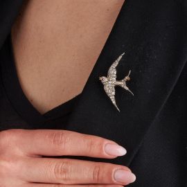 SWALLOW-SHAPED RUBY AND DIAMOND BROOCH IN GOLD AND SILVER