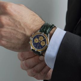 cassa in acciaio, fondello a vite, ghiera girevole in oro giallo 18kt con cavalieri in acciaio, tasti cronografici a pompa, quadrante blu con contatori cronografici color oro, indici applicati, grafica oro, movimento a carica manuale cal Lemania 1873 n. 4428305, cinturino originale in pelle, fibbia in acciaio marcata Breitling, vetro minerale. Diam. mm 36