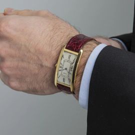 cassa di forma rettangolare in oro giallo 18kt, fondello serrato con viti recante personalizzazione con dedica e anno, fondello interno marcato European Watch and clock Co., corona con zaffiro cabochon, quadrante argenté firmato Cartier France, grafica nera, numeri romani a smalto, movimento a carica manuale marcato European Watch Co. n. 32340, cinturino non originale in pelle marrone, fibbia deployant in oro giallo 18kt non marcata, vetro ricurvo, gr. 43. Dim. mm 23x42