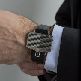 cassa di forma in oro bianco 18kt, fondello serrato con viti, corona marcata, quadrante nero sormontato da struttura a radiatore Rolls Royce, ansa superiore sormontata dalla silhouette Spirit of Ecstasy, movimento a carica manuale, cinturino originale in pelle nera, fibbia in oro bianco 18kt, gr. 47. Dim. mm 40x29.