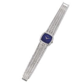 cassa di forma in oro bianco 18kt, fondello serrato con viti, lunetta impreziosita da una fila di diamanti, quadrante lapislazzuli, grafica argento, movimento a carica manuale, bracciale a maglie intrecciate in oro bianco 18kt satinato con chiusura a scomparsa in oro bianco 18kt marcata Piaget, gr. 55. Dim. mm 23x23