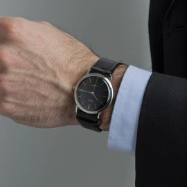 cassa in acciaio, fondello a pressione, quadrante nero, grafica argento, indici applicati, secondi a ore sei, movimento a carica manuale cal Felsa 320, cinturino originale in pelle nera, fibbia in metallo, vetro plastica. Diam. mm 34