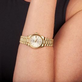 cassa in oro giallo 18kt, fondello serrato a vite marcato 6800, corona marcata, ghiera zigrinata in oro giallo 18kt, quadrante argenté, grafica nera, indici applicati con trizio, movimento a carica automatica cal 2030 n. 898361, bracciale president in oro giallo 18kt ref. 8389, lungh. interna cm 20, chiusura a scomparsa marcata Rolex, vetro plastica, gr. 92. Diam. mm 29