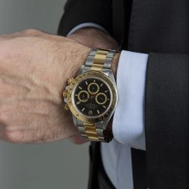 cassa in acciaio, fondello serrato a vite, corona marcata e pulsanti a vite, ghiera in oro giallo con scala tachimetrica a 200, quadrante nero con contatori champagne, grafica oro, indici applicati al trizio, contatore dei secondi a ore nove, contatore dei minuti a ore tre, contatore delle ore alle sei, movimento a carica automatica, bracciale oyster a maglie piene in acciaio e oro ref. 78363 cod. produzione N9, lungh. interna cm 19, chiusura a scatoletta in acciaio marcata Rolex, vetro minerale. Diam. mm 40. Corredato di scatola, controscatola e garanzia.