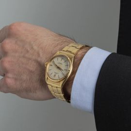 cassa in oro giallo 18kt, fondello serrato a vite, lunetta zigrinata, corona marcata, quadrante bianco guilloché ristampato, grafica nera, indici triangolari, movimento a carica automatica cal 30710 n. F84524, bracciale a maglie elastiche rivettate in oro giallo 18kt marcato G.F. con finali 57, lungh. interna cm 18, chiusura a scatoletta in oro giallo, vetro plastica, gr. 86. Diam. mm 33