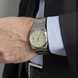 cassa in acciaio, fondello serrato a vite, lunetta liscia in acciaio, quadrante argentè, grafica nera, indici applicati al trizio, datario a ore tre con lente cyclope, movimento al quarzo, bracciale a maglie in acciaio, lungh. interna cm 19, chiusura a scatoletta in acciaio marcata Rolex, vetro minerale. Diam. mm 36. Corredato di controscatola e garanzia.