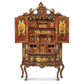 in legno laccato e dorato con rilievi a pastiglia, fronte e fianchi di linea mossa, cimasa intagliata con intagli vegetali dorati e stemma entro cartouche ad impreziosirla, doppio sportello con specchi a celare ricco interno composto da una serie di vani di varie forme e dimensioni, sorretti da colonnine ebanizzate e dorate ed intaglio di forma ondulata a simulare un tendaggio nella parte superiore. Il mobile, anche al suo interno, è interamente laccato sui toni del rosso e del giallo con particolari dorati, e ornato da decorazione a motivi floreali e, all'interno delle ante, dai tipici vasi di fiori entro riserve. Il piano a ribalta nasconde invece una serie di vani e cassetti di forma, dimensione e intaglio diversi, due tiretti ed ulteriori tre cassetti sottostanti, di cui l’ultimo, di linea sagomata, prosegue su fascia sorretta da quattro gambe arcuate, cm 240x145x58
