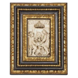 in avorio entro cornici in legno raffiguranti due scene d'interno minuziosamente scolpite raffiguranti Giocatori di scacchi e Giocatori di carte, cm 14,6x8,9, entro cornice in legno intagliato e dorato, cm 29,5x23,5