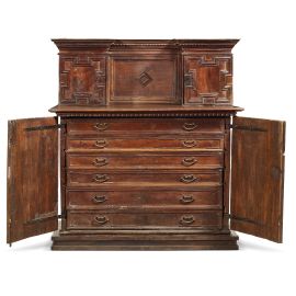 in legno intagliato, il corpo superiore composto da due sportelli laterali e vano centrale sformellati e chiusi in alto da cornice dentellata, il corpo inferiore con due grandi ante al cui interno si trovano sei cassetti, poggiante su pedana non pertinente, cm 170x148x90