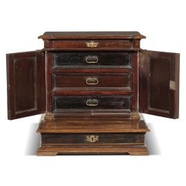 in noce con applicazioni in bronzo dorato, piano sagomato con sottofascia a cassetto, fronte con doppio sportello a nascondere tre cassetti, due paraste a doppia voluta con dettagli dorati ad impreziosire gli angoli; alla base piano d'appoggio con cassetto, cm 85x85x76