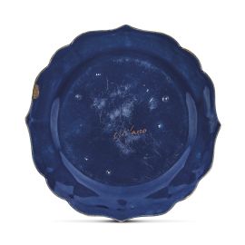 Il piattino ha forma circolare e orlo sagomato a sei punte, ed è privo di appoggio; il decoro “a comparto blu“ prevede al centro una grande riserva polilobata con un decoro a “paesini e figure” in monocromia rossa con isole abitate da alberelli, due viandanti su un cavallo, un cervo in corsa e nel cielo un uccello in volo con piccoli insetti. La tesa e il retro sono interamente ricoperti di smalto color cobalto. Tra i pochi confronti per le opere realizzate in rosso ferro si rimanda alle opere del Museo Gianetti di Saronno e al piatto esposto al Poldi Pezzoli a Milano nel 1964.