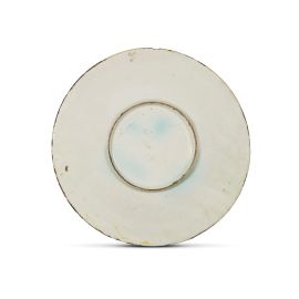 in maiolica dipinta a policromia in blu cobalto, giallo ocra aranciato, giallo antimonio, verde ramina, bruno; diam. cm 23, diam. piede cm 10,5, alt. cm 2,8