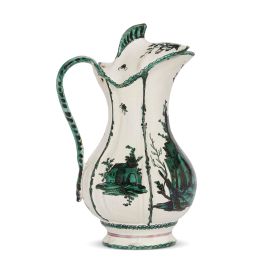 In maiolica dipinta in monocromia verde e manganese. Firma Jaques Boselly in bruno di manganese; versatoio alt. cm 28, diam. base cm 9,2; bacile cm 6,5x36x28,5