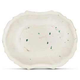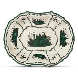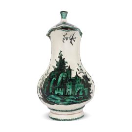 ll versatoio presenta corpo piriforme con ventre espanso in basso e costolatura rilevata, coperchio sagomato sormontato da una presa “a cimiero”, ansa a nastro che scende sinuosa fino al ventre, piede appena estroflesso con base concava; il bacile, su base piana, ha profilo polilobato sagomato a spigoli vivi e orlo centinato e rialzato. Forme queste evidentemente ispirate a modelli di argenteria, possibilmente genovese. Entrambi i pezzi sono interessati da una decorazione in verde smeraldo di grande intensità, con un’unica concessione di altra cromia per il decoro sul piede del versatoio. L’ornato si esprime nella raffigurazione di paesaggi con case accostate, archi, torri e tetti a cuspide, il tutto inserito in metope chiuse da un motivo a rami spogli, con alcune riserve occupate da uccelli lacustri in volo con un ramo nel becco.