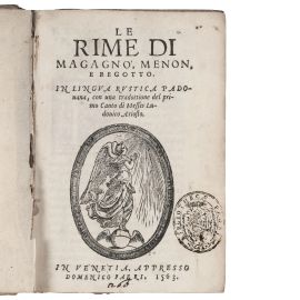 (Dialetto padovano) MAGANZA, Giovanni Battista - THIENE, Marco - RAVA, Agostino. Le Rime di Magagnò, Menon e Begotto. In lingua rustica padouana, con una tradottione del primo canto di messer Ludouico Ariosto. In Venetia, appresso Domenico Farri, 1563. [Rilegato con:] La seconda parte del le rime di Magagnò Menon e Begotto. In Venetia, Gregorio Donato, 1584.