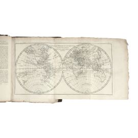 Esemplare completo e in barbe di questo atlante “dressé pour l’Historie philosophique & politique des establissements & du commerce des Européens dans les deux Indes”. Particolarmente interessanti le oltre venti carte geografiche relative all’America e alle isole (Antille, Santo Domingo, Giamaica, Cuba, Guadalupe, Martinica, Isole Vergini), e le 23 tabelle sinottiche con dati statistici come: numero di parrocchie, di abitanti bianchi, mulatti, neri liberi e schiavi, e produzione di frutta, ecc. a Portorico e Cuba; commerci della Gran Bretagna con le Indie Orientali e con le Americhe; produzione d’oro e d’argento invita da Cuba ecc. in Spagna; stato delle finanze della Francia nel 1774, anno della morte di Luigi XIV, ecc.; tavola delle specie, quantità e valore delle merci inviate annualmente dal Brasile al Portogallo (diamanti, oro, zucchero, tabacco, cotone, legno, riso, caffè, cacao, cannella, indaco, olio di balena, zenzero …).