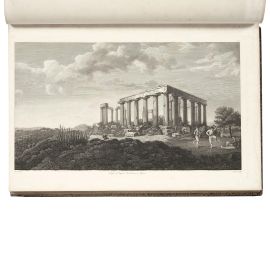 (Napoli) MAJOR, Thomas. The Ruins of Paestum. London, Published by T. Major. Printed by James Dixwell, 1768. Primo resoconto dettagliato delle rovine scoperte nel 1746, completo delle 25 tavole incise con vedute e piante dei templi. In folio atlantico in mezza pelle coeva (sciupata, cerniere fragili). [iv] iv [v] 6-44 [2] pp. di testo con testatine calcografiche, seguite da 25 tavole calcografiche. Pagine di testo un po’ ingiallite, una minima gora pallida all’angolo inferiore, per il resto interno molto buono. [CON:] STANHOPE John Spencer. Olympia, or Topography illustrative of the actual State of the Plain of Olympia, and the Ruins of the City of Elis. London, Rodwell & Martin, 1824. Copia con scritta coeva “from the author” alla sguardia volante. In folio atlantico in mezzo vitellino coevo (difetti) illustrato da 14 tavole calcografiche (2 mappa a doppia pagina e 12 vedute e una tavola con monete), collazionato completo. -- Pallide fioriture e arrossature ai margini di alcune carte. [CON:] The Antiquities of Ionia … part the second. London, W. Bulmer and Co., 1797. In folio atlantico in vitellino coevo decorato in oro (piatti staccati, sbucciature al dorso), con 63 tavole calcografiche (lix iv), molte con splendide vedute.