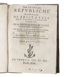 (Politica - Filosofia - Manuzio - Verona - Casanova) DI GOZZE, Nicola Vito. Dello stato delle republiche secondo la mente di Aristotele con essempi moderni giornate otto. In Venetia, presso Aldo, 1591.