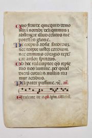 Grande “E” (ca. 84 x 84 mm) miniata a tempera e oro su foglio pergamenaceo (508 x 364 mm), da antifonario.