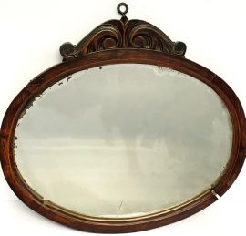 2 piccole specchiere ovali con cornici in legno, di cui una più grande con cimasa intagliata con due volute vegetali contrapposte, cm 42x47, danni e mancanze; la più piccola con cimasa vegetale traforata, cm 39,5x39,5, fine sec. XIX/inizio sec. XX, danni
