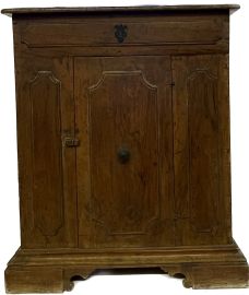 Piccolo mobile con fronte pannellato a uno sportello, piano rettangolare incernierato, piedi a mensola, costruito con elementi antichi da un inginocchiatoio, fine sec. XVII, cm 87x74,5x25,5