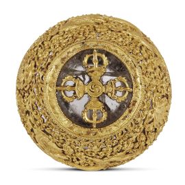 in Cristallo di roccia con eleganti decorazioni in bronzo dorato. La parte superiore della ciotola è splendidamente ornata con pedali di fiore di loto stilizzati e raffigura otto tesori preziosi nella sua zona superiore. Proseguendo verso il centro, due draghi sono raffigurati mentre giocano con una gemma di fuoco, mentre una creatura mitologica, dalla corporea di pesce e testa di aquila, sorregge un serpente. La base è finemente decorata con il motivo del Gada Vajra.