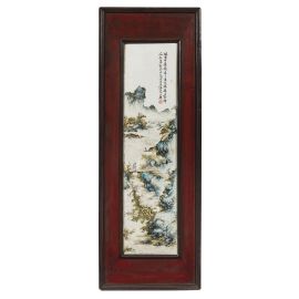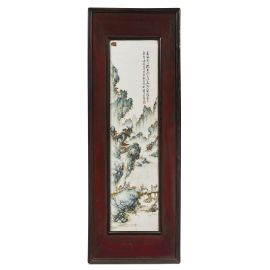 in porcellana policroma, incorniciate con legno pregiato, raffiguranti paesaggi incantevoli, reca il timbro di Zhang Peixuan. I dettagli finemente lavorati e l'uso sapiente dei colori riflettono l'estetica e la sensibilità dell'epoca.