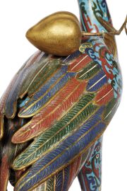 in cloisonné, esemplari raffinati che incarnano l'estetica antica della Cina. Le figure eleganti di gru, simboli di longevità e prosperità, tengono con grazia rami di fiori Mei nei loro bei becchi. L'abilità artigianale esemplare si manifesta attraverso la tecnica sofisticata del cloisonné, una tradizione centenaria che dona a questi manufatti un'aura di preziosità e raffinatezza. Una testimonianza tangibile dell'arte e della maestria artigianale cinese.