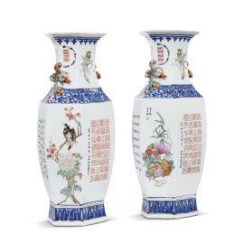 清 十九至二十世纪 青花粉彩麻姑献寿纹石榴耳六方瓶一对 高 59,5厘米