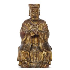 in legno laccato e dorato, la prima scultura ritrae Wenchangjun, una figura venerata nella mitologia cinese come dio della letteratura e della cultura. La precisione dei dettagli e l'uso sapiente del dorato accentuano la sacralità e l'importanza culturale di questa divinità. La seconda scultura cattura l'eleganza di una nobildonna attraverso linee fluide e armoniose. L'uso del legno laccato e dorato conferisce alla figura un'aura di nobiltà e raffinatezza, evidenziando il prestigio sociale della donna ritratta.