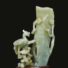 in giada verde con accenti arancioni di ferro, raffigurante una fenice posata su funghi Lingzhi. Accanto, si erge un albero di fiori Mei con Qianlongnianzhi intagliati sotto l'albero. Un'opera straordinaria che combina la maestria dell'intaglio nella giada con una composizione artistica ricca di simbolismo e dettagli intricati.
