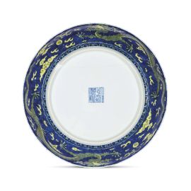 The patterns and composition of this artifact resemble other dragon-themed porcelain from the Qianlong period. What sets it apart is the unique use of yellow glaze as a decorative element rather than as the base color, depicting intricate designs of dragons and clouds. The production of blue and yellow porcelain involves a two-stage firing process, initially firing the blue ground with white floral patterns and subsequently adding yellow color in the white glazed areas, followed by a second firing in the kiln. According to Volume 17 of the "History of the Palace of the Great Qing Dynasty," such blue and yellow dragon-patterned bowls and plates were typically used by concubines within the imperial palace.