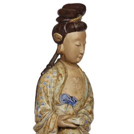in porcellana policroma, maestosamente raffigurante Guanyin, la Bodhisattva della compassione. La divinità, con grazia eterea, regge con la mano destra un Rotolo delle sacre scritture buddiste, simbolo di saggezza e illuminazione. I toni delicati e vivaci della policromia impreziosiscono ogni dettaglio.