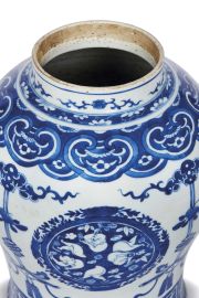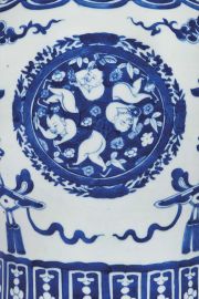 in porcellana bianco blu a forma di JiangJunping dipinto con sfere con all'interno tre bambini che hanno in mano degli oggetti: letteratura, musica e economia. La spalla è decorata con nuvole a forma di ruyi. Il collo decorato con rami di fiori. Tra le sfere decori con pipistrello che tiene un fiocco di ruyi, rami di pesca e simbolo di fortuna.Nella parte inferiore si presentano decori petali di fiore stilizzato.Il coperchio non è pertinente al vaso.reca machio Chenghua sotto la base.