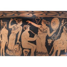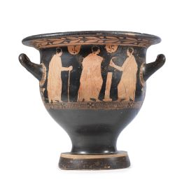 Grande cratere di ottima fattura attribuibile al Pittore di Meleagro, ceramografo attico attivo ad Atene negli anni compresi tra la fine del V secolo e l'inizio del IV secolo a.C. I suoi prodotti sono diffusi anche in Italia in tombe soprattutto di Spina.