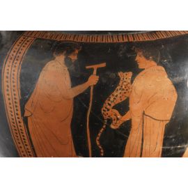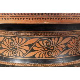 Cratere di pregiata fattura la cui origine è da considerarsi vicina al Pittore dell'Orto, caratterizzato da orlo a tesa orizzontale, alto collo a profilo concavo, distinto, anse a colonnette, spalla arrotondata, corpo ovoide e piede modanato.