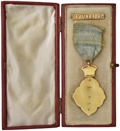 REGNO UNITO. DECORAZIONE MASSONICA IN ORO CON DIAMANTI CHE COMMEMORA IL REGNO DELLA REGINA VICTORIA NEL 1897. MONTATA SU LOBATURA IN METALLO DORATO.