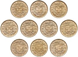 SVIZZERA. DIECI MONETE DA 20 FRANCHI