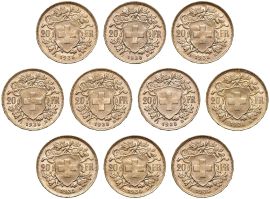 SVIZZERA. DIECI MONETE DA 20 FRANCHI