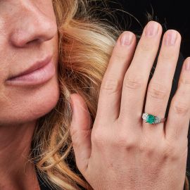 in oro bianco e giallo 18kt, impreziosito al centro da uno smeraldo taglio ottagonale di ct 0.90 circa, affiancato da diamanti taglio brillante, punzoni 750 e del fabbricante, mis. 11/51, gr. 4